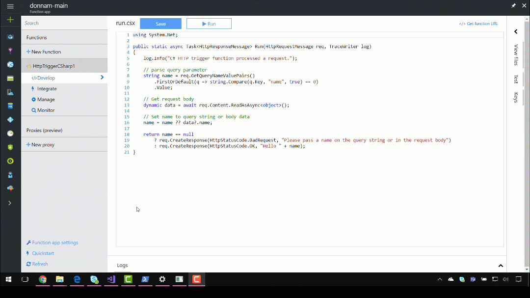 Azure Functions now supports publishing a class library as the implementation for one or more functions in a Function App. We’ve also recently made several runtime improvements to make assemblies much more useful, such as shadow-copying managed assemblies to avoid file locking issues and restarting the Functions runtime to pick up newly deployed binaries.