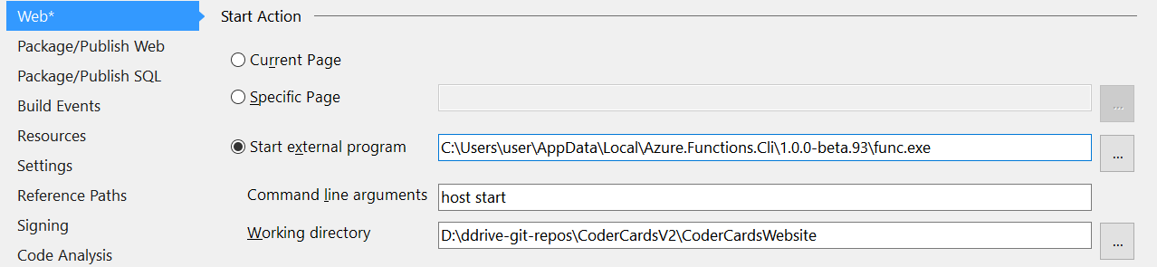 - Open the project properties. In the Web tab, choose Start External Program
