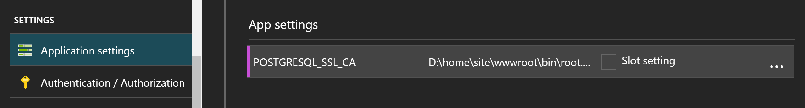 - Select your existing Web app and click on Application settings. Add the following app setting for your web app: