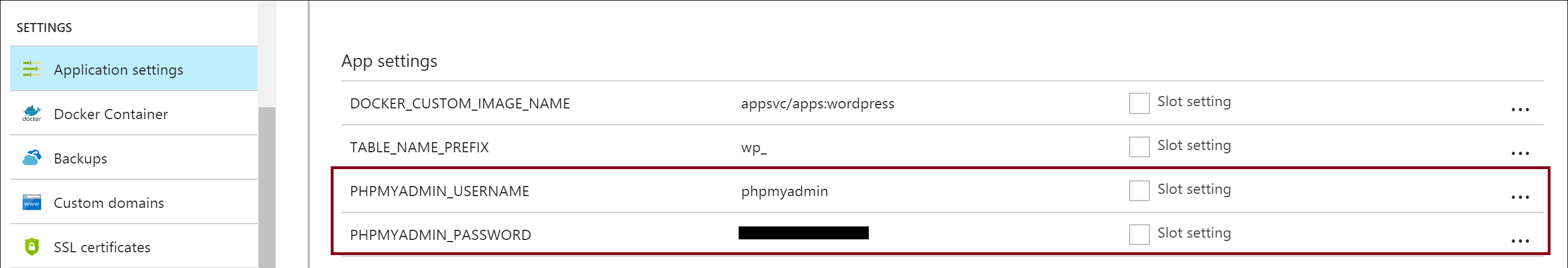 You can find the credentials for PHPmyadmin in the Azure portal . Select your web app , then select Application Settings -> App settings