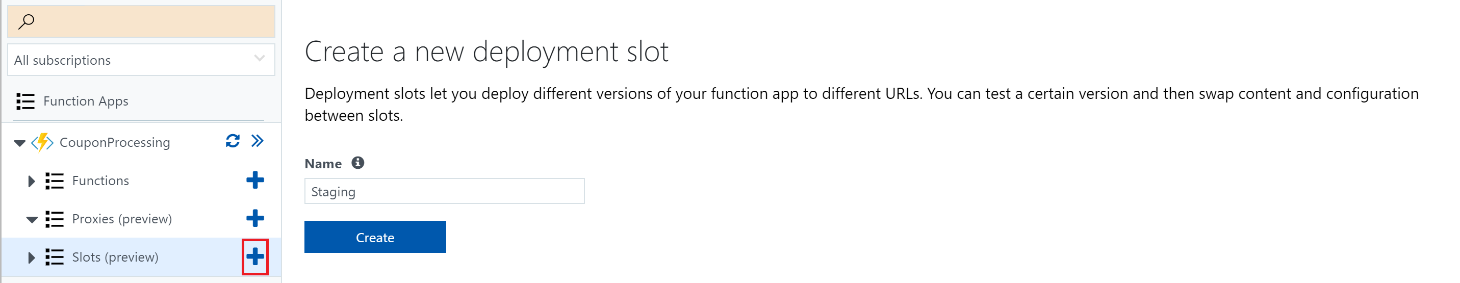 You can explore the deployment slots preview via Azure Portal. Each Function App includes a view of deployment slots. The preview requires a one-time opt-in for each Function App available under the Function App's