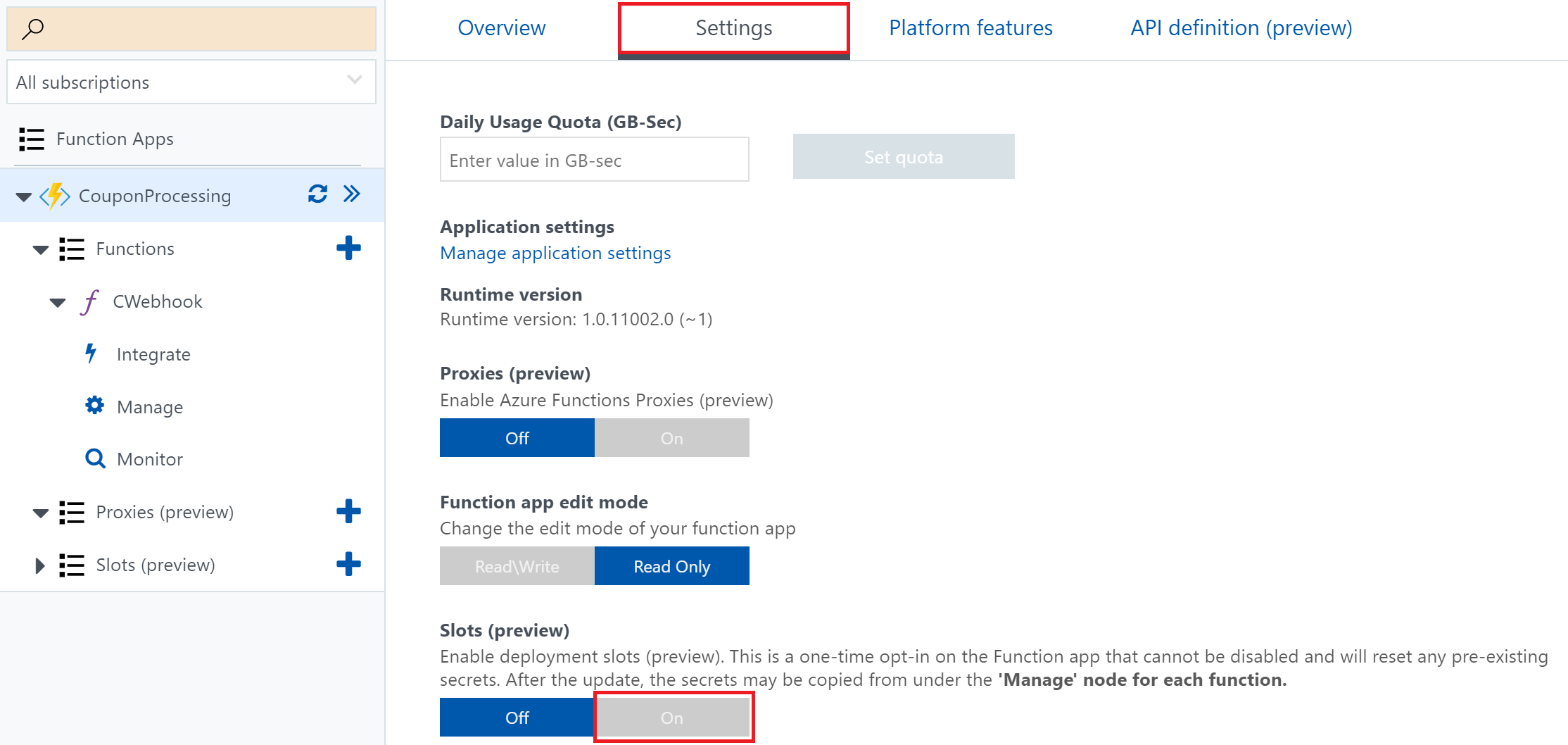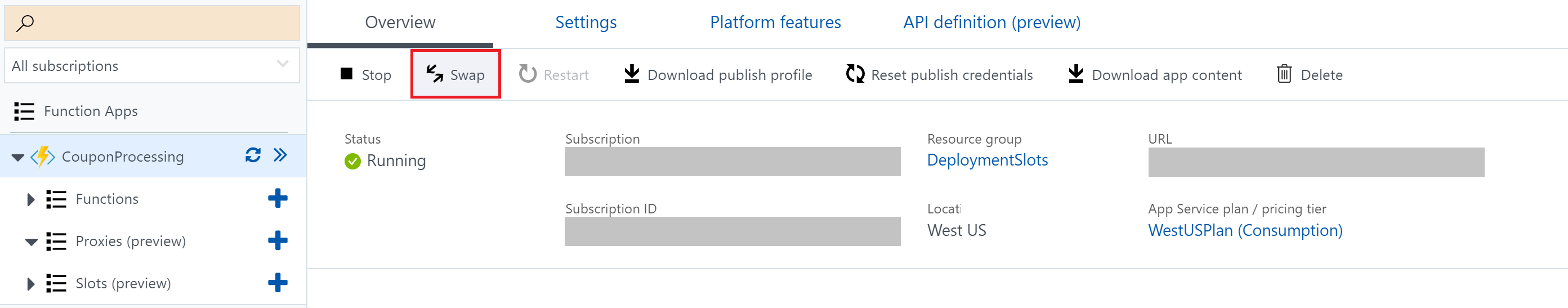 Overview tab for your Function App.