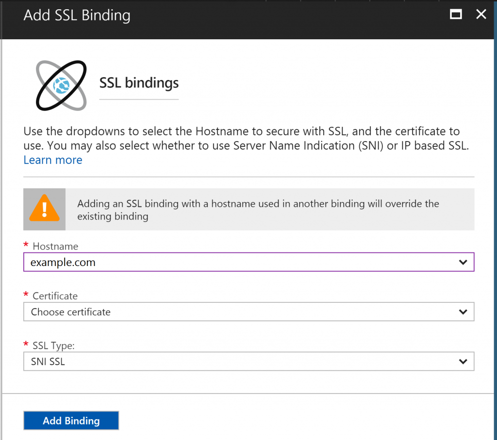 - Using a self-signed certificate : In this case avoid using Self signed certificate since we cannot verify the domain ownership . This is not supported with Azure web apps