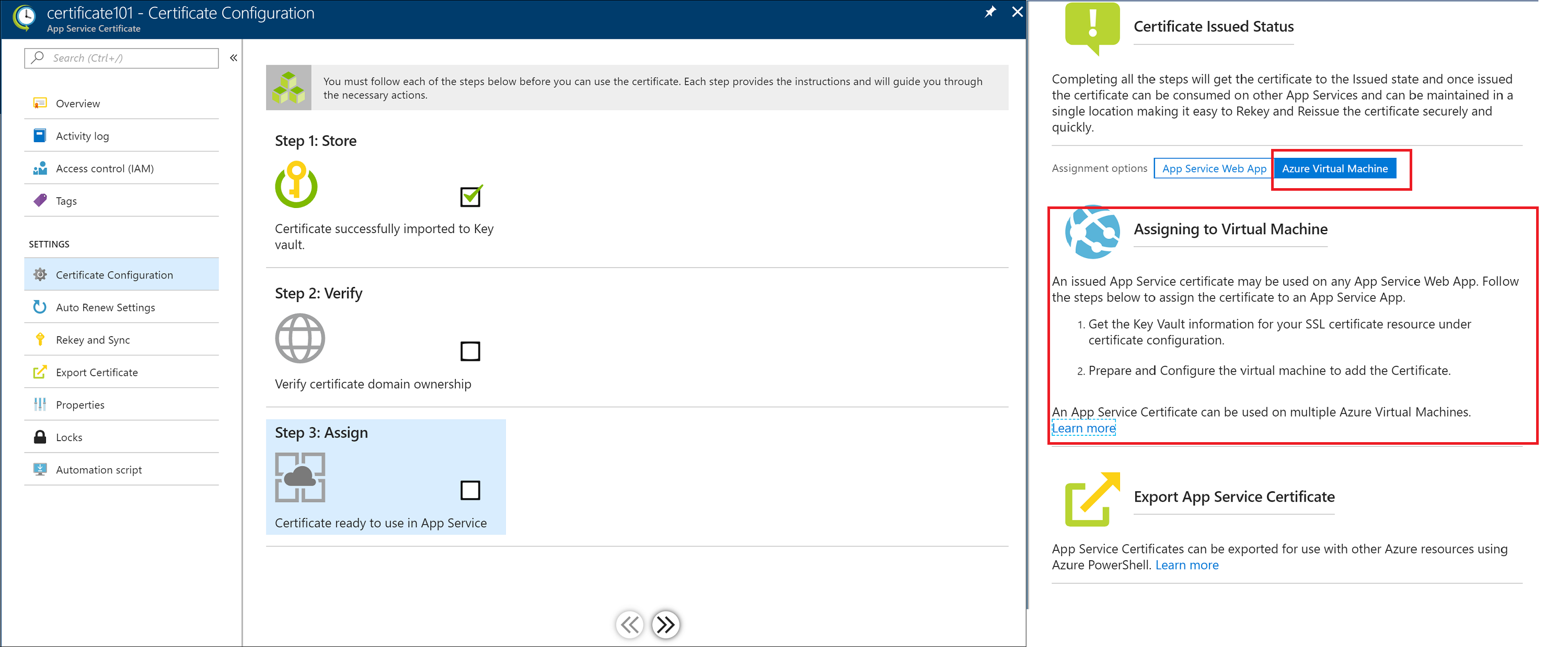 App Service Certificate can be used for other Azure service and not just App Service Web App. This tutorial shows you how to secure your web app by purchasing an SSL certificate using App Service Certificates , securely storing it in Azure Key Vault , domain verification and configuring it your virtual machine . Before your begin log in to the Azure portal at https://portal.azure.com