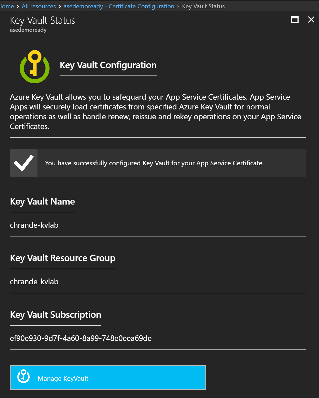 Once you have selected the Key Vault Repository to store this certificate in, the Store option should show success.