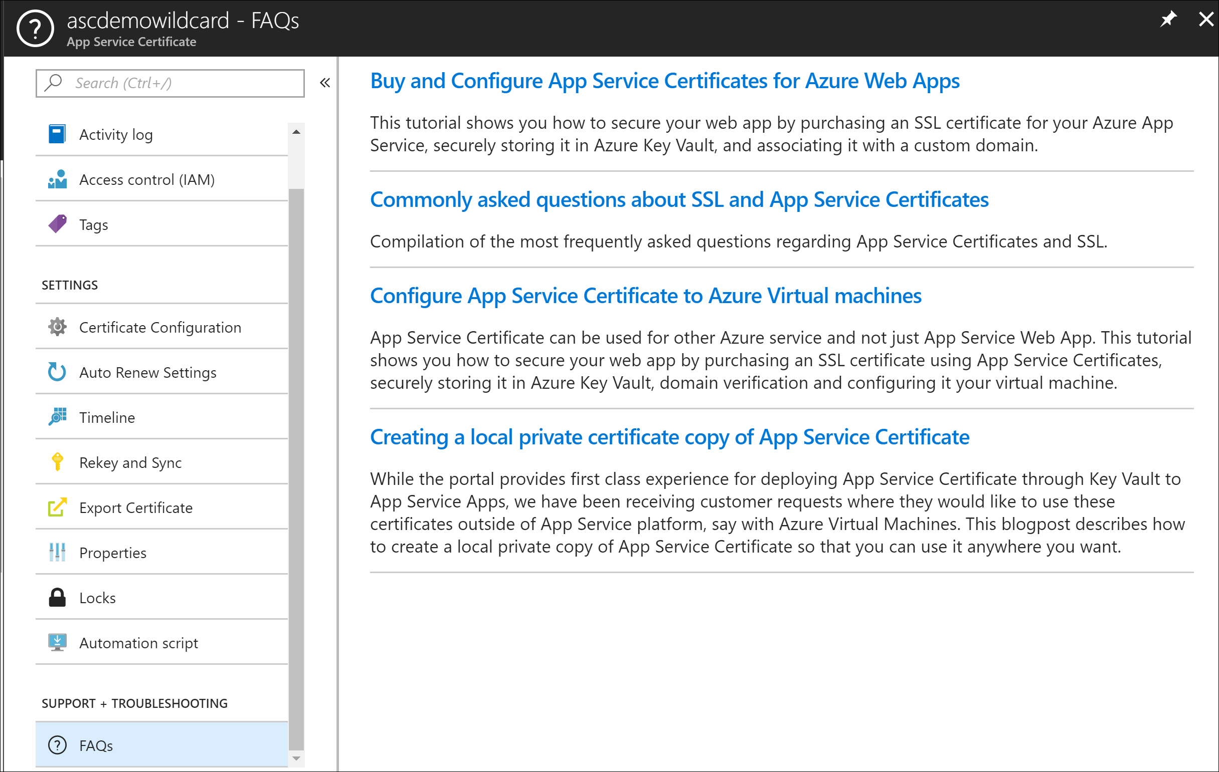 - Refer to FAQs documentation : Get access to appropriate documentation to App Service certificates to help resolve the issue with Configuration , Rekey and Sync , Renewal etc .