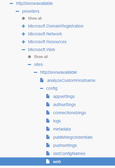 Subscription > Resource Group > your site name > Providers > Microsoft.Web > sites > your site name > config > web