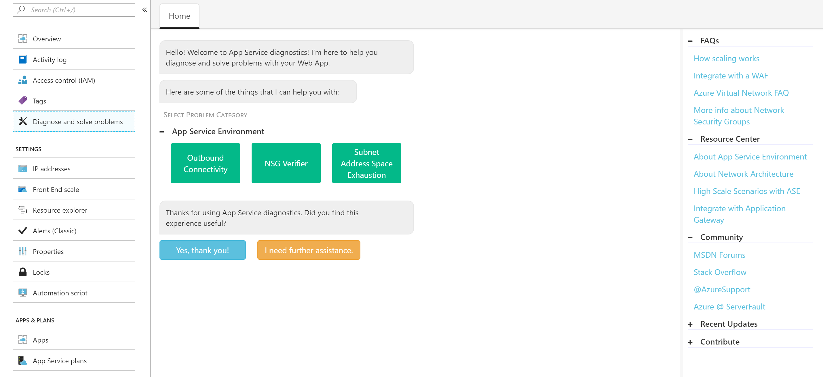 Next time you’re having issues with an unhealthy web app, App Service Environment, or Function, try out App Service Diagnostics to talk to Genie to get guidance on how to cure for your unhealthy web app. If you haven’t already, definitely leverage App Service Diagnostics to run a health checkup for piece-of-mind or drill-down to your specific issue that’s happening to your app.