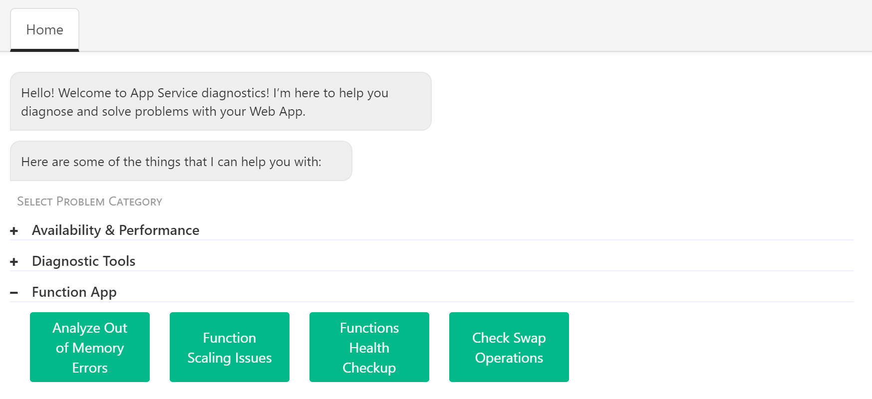 For each service, we have tailored the troubleshooting problem categories to cater to the most common scenarios that customers have been looking to diagnose and troubleshoot. For example, for Functions, you can now
