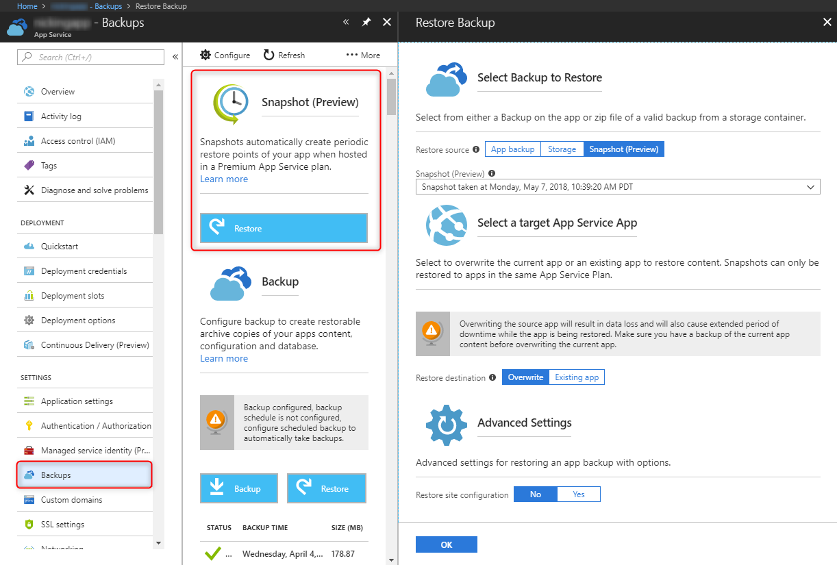 Today we are announcing the public preview release of Azure App Service Snapshots. Snapshots are automatic periodic backups available for Premium SKU web apps. Snapshots are managed internally by Azure App Service and provide reliable, hassle-free backups of your web apps.