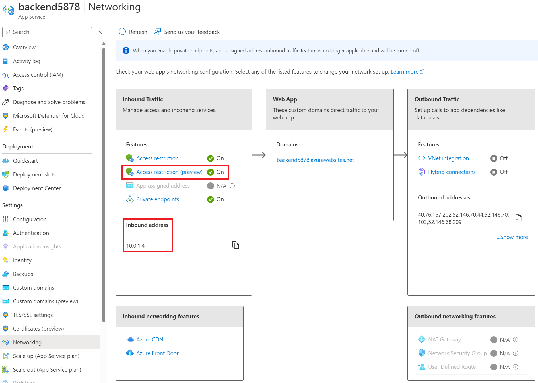 If you go back to the Networking page for your backend web app, you’ll see that the inbound address has changed to a private IP address from your virtual network. You’ll also see that access restrictions have turned on. If you view the Access restriction (preview), you see public access has been disabled. Disabling public network access blocks all incoming traffic except the traffic that comes from private endpoints.