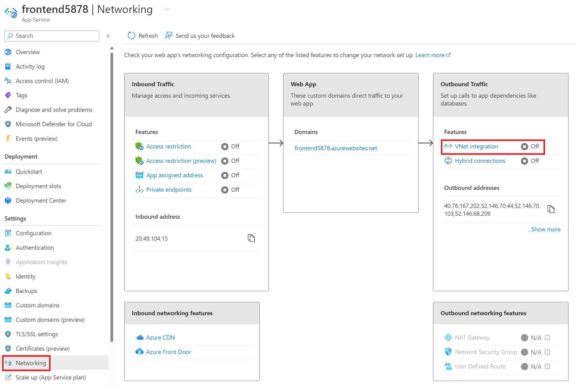 - In the Azure portal, go to your frontend web app and then go to the Networking page.