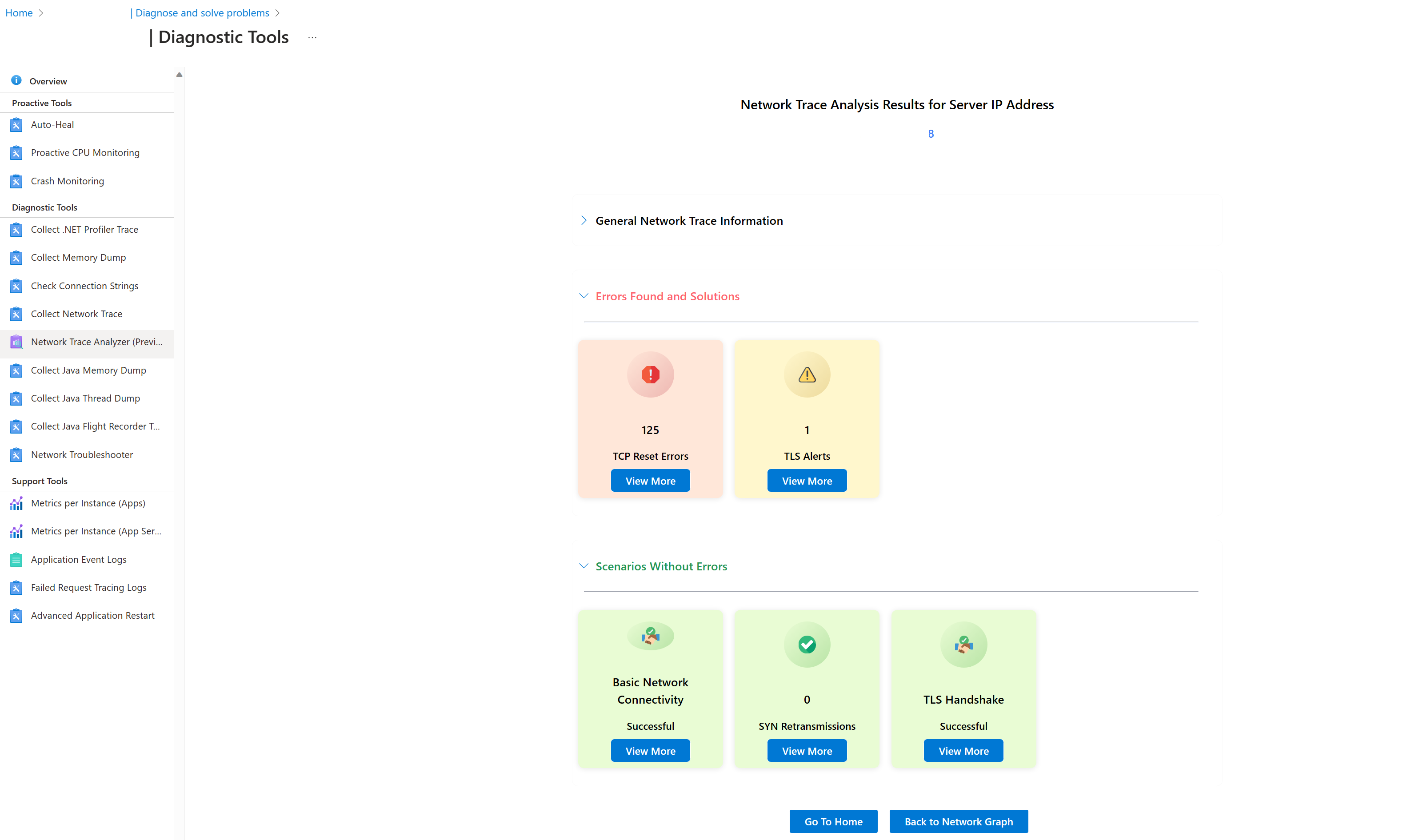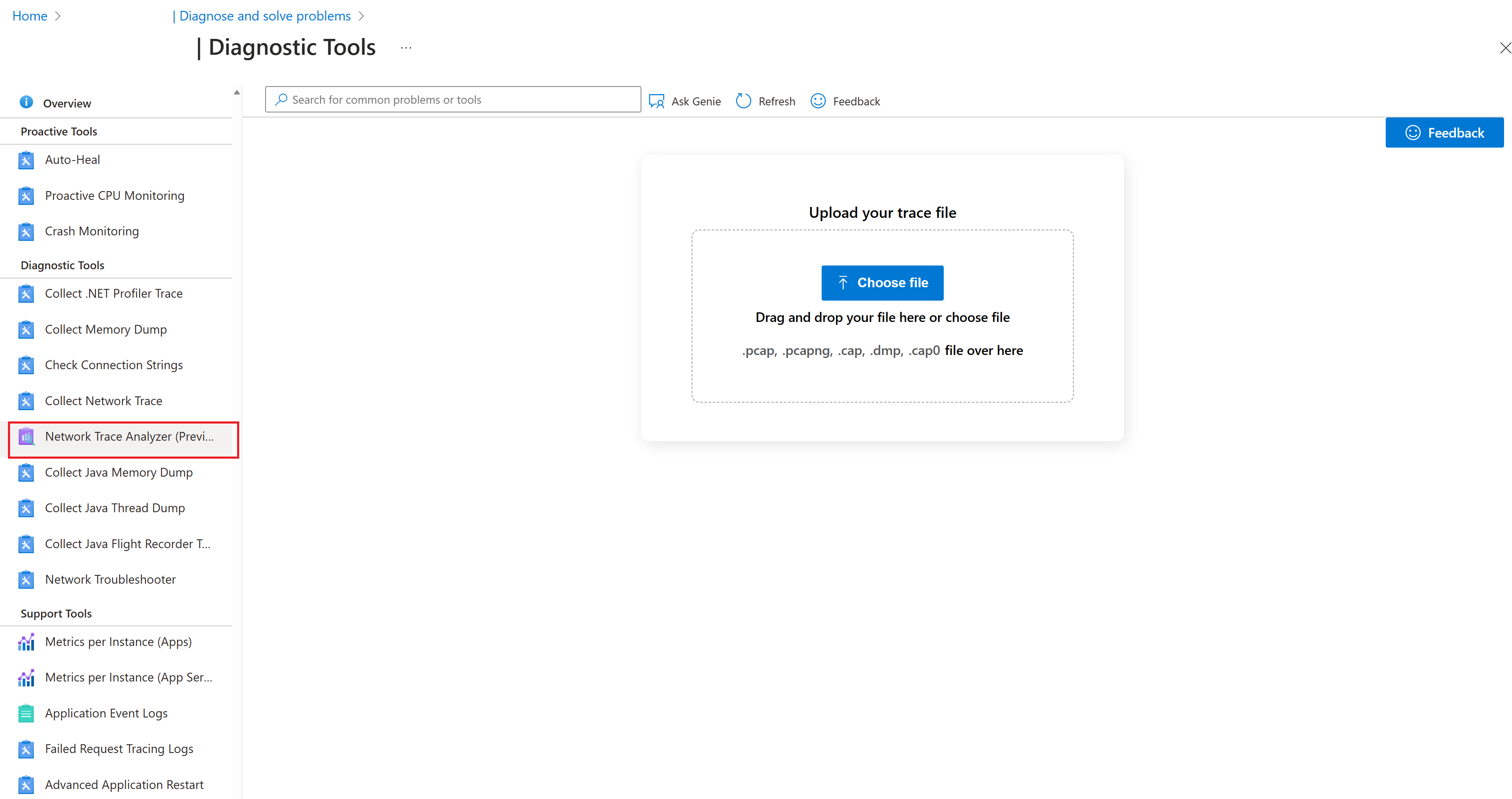 To access the Network Trace Analysis tool, navigate to the Diagnose and Solve Blade > Diagnostics Tools and select Network Trace Analyzer.