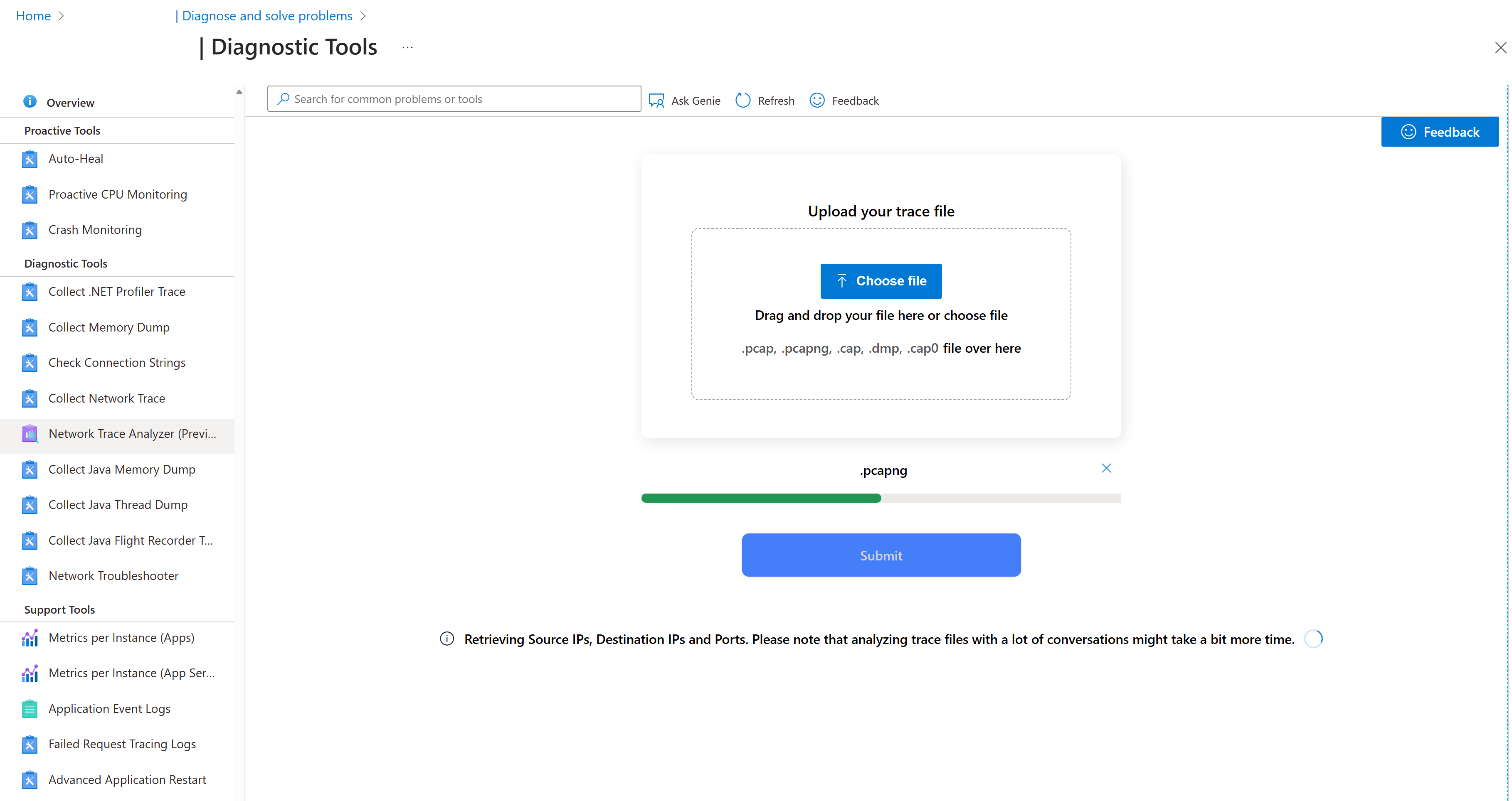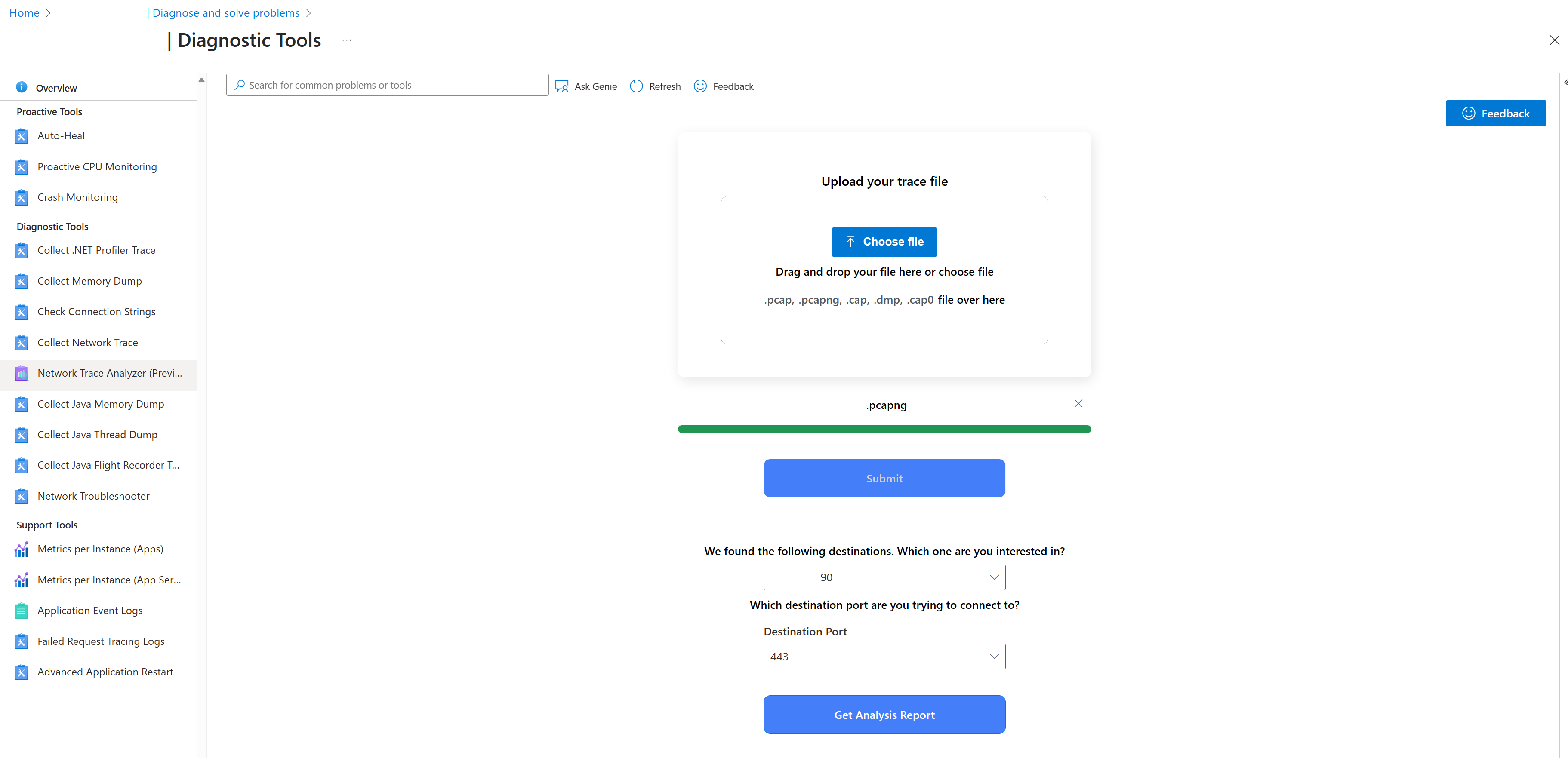 Capturing the right network trace at the right time is only half the battle. The major challenge often lies in interpreting the network trace, a task that requires not only the right tools but also a deep understanding of network protocols and behaviors. This innovative addition is now available in the Diagnose and Solve Problems blade in the Azure portal and is designed to streamline the process of analyzing network traces and troubleshooting issues within your web application.