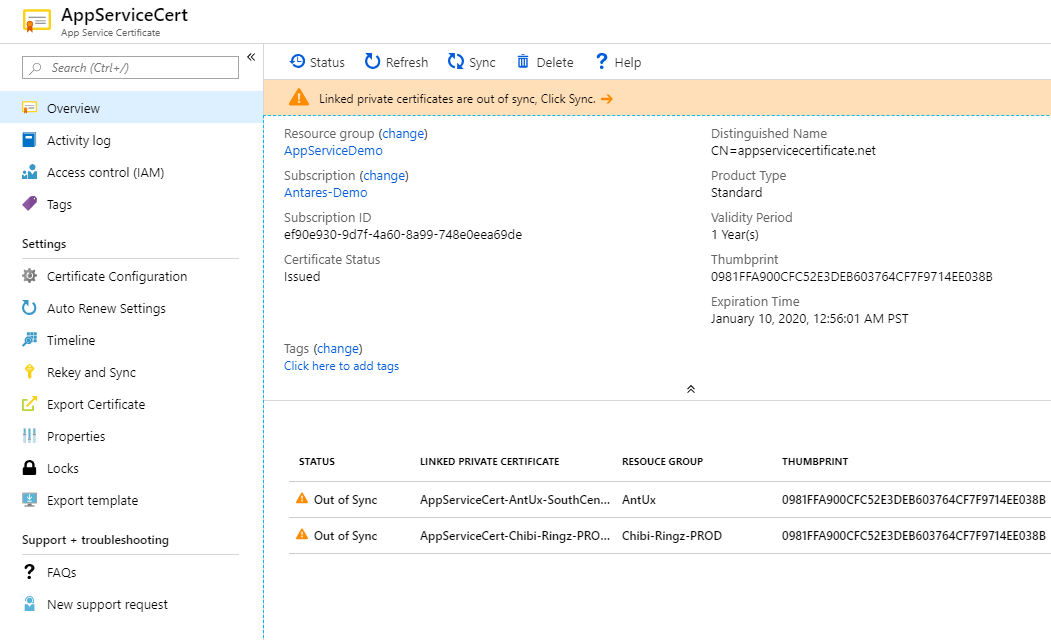 This model allows you to perform a rekey or a renew and leave the UI and continue with your work in the portal. When you return to the App Service Certificate blade, you will see the out-of-sync certificates. At this point, you can either let the automatic sync task take care of it, or sync it manually using the button.