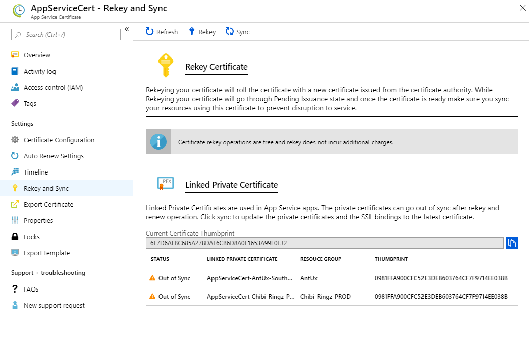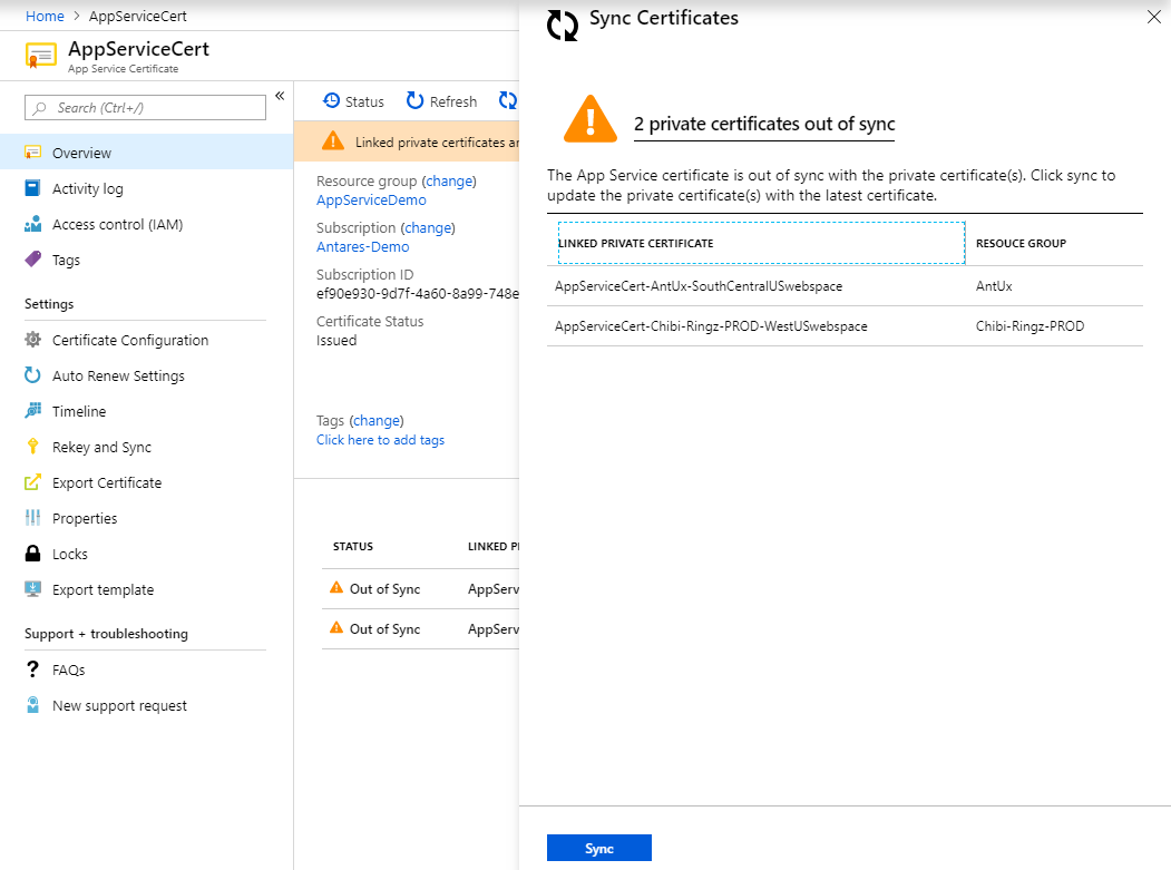 App Service Certificates have been a very popular feature among App Service customers. However, our customers often get confused about the sync scenarios between App Service Certificates and Linked Private certificates. Specifically during the Manual Renew, Manual Rekey, and Auto Renew operations. This blog will showcase recent UX improvements to give you control over the sync scenarios. We will also talk about the internals of the automatic sync tasks running in the background to keep your certificates and SSL bindings synced up automatically.